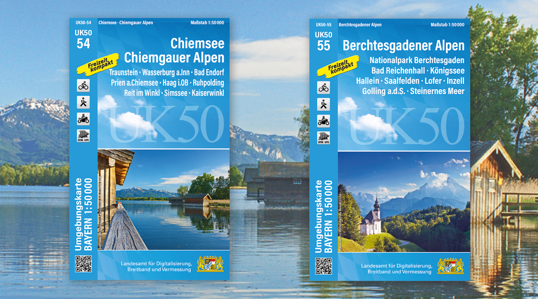 Pünktlich zum Ferienstart sind die neuen Umgebungskarten UK50-54 "Chiemsee – Chiemgauer Alpen" und UK50-55 "Berchtesgadener Alpen" in neuer Auflage erschienen. Die Karten im Maßstab 1:50 000 sind ideale Begleiter zu den schönsten Ausflugszielen in der Region, zum Radeln und zum Wandern.