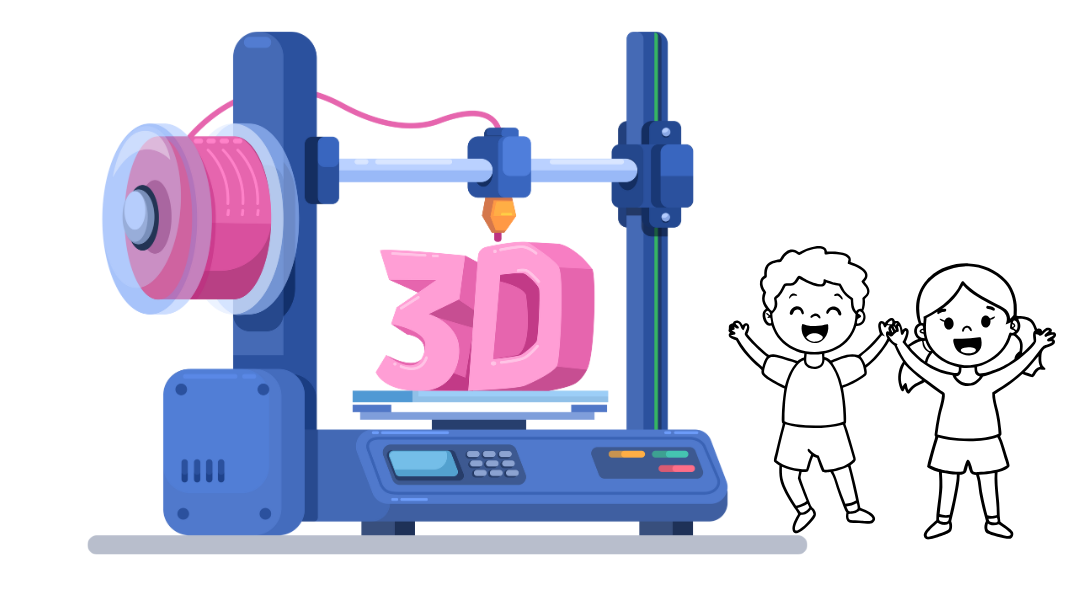Ein blauer 3D-Drucker im Comic-Stil druckt das Wort 3D in rosa aus. Daneben, im Stil einer Bleistiftzeichnung, tanzen ein Junge und ein Mädchen und lachen.