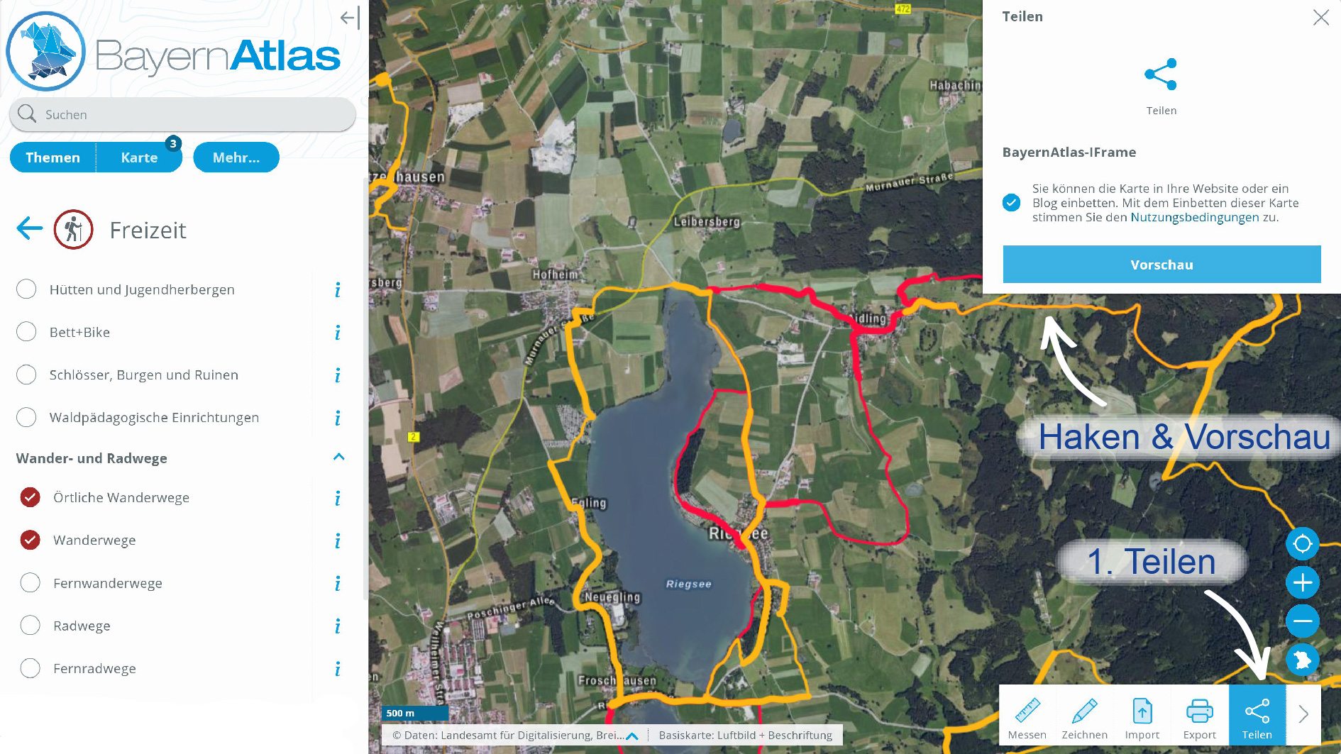 Über den Werkzeug-Button unten rechts öffnet sich die Werkzeugleiste, in der Sie die Funktion Teilen anwählen. Im sich öffnenden Fenster Teilen klicken Sie auf den Button Vorschau, nachdem Sie den Nutzungsbedingungen zugestimmt haben. Es öffnet sich das Fenster BayernAtlas-iFrame, in dem die Größe des Kartenfensters und die responsive Breite eingestellt werden können.